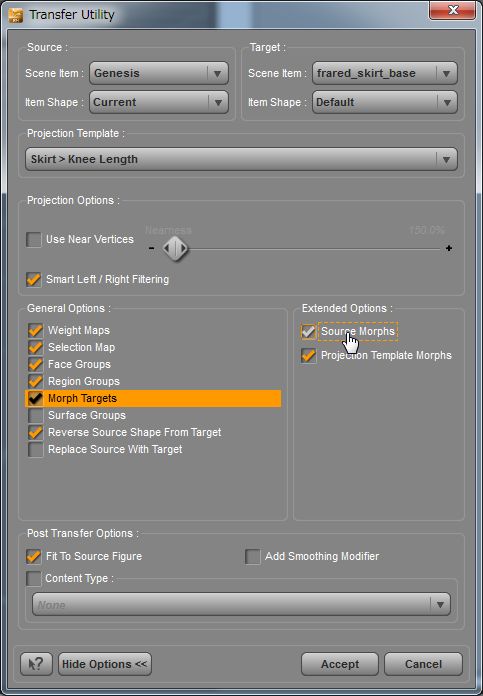 失敗事例2(フレアスカート)で、Basic Femaleにあわせて作った服にTransfer Utilでリグを埋め込む場合のオプション設定がわかりました。